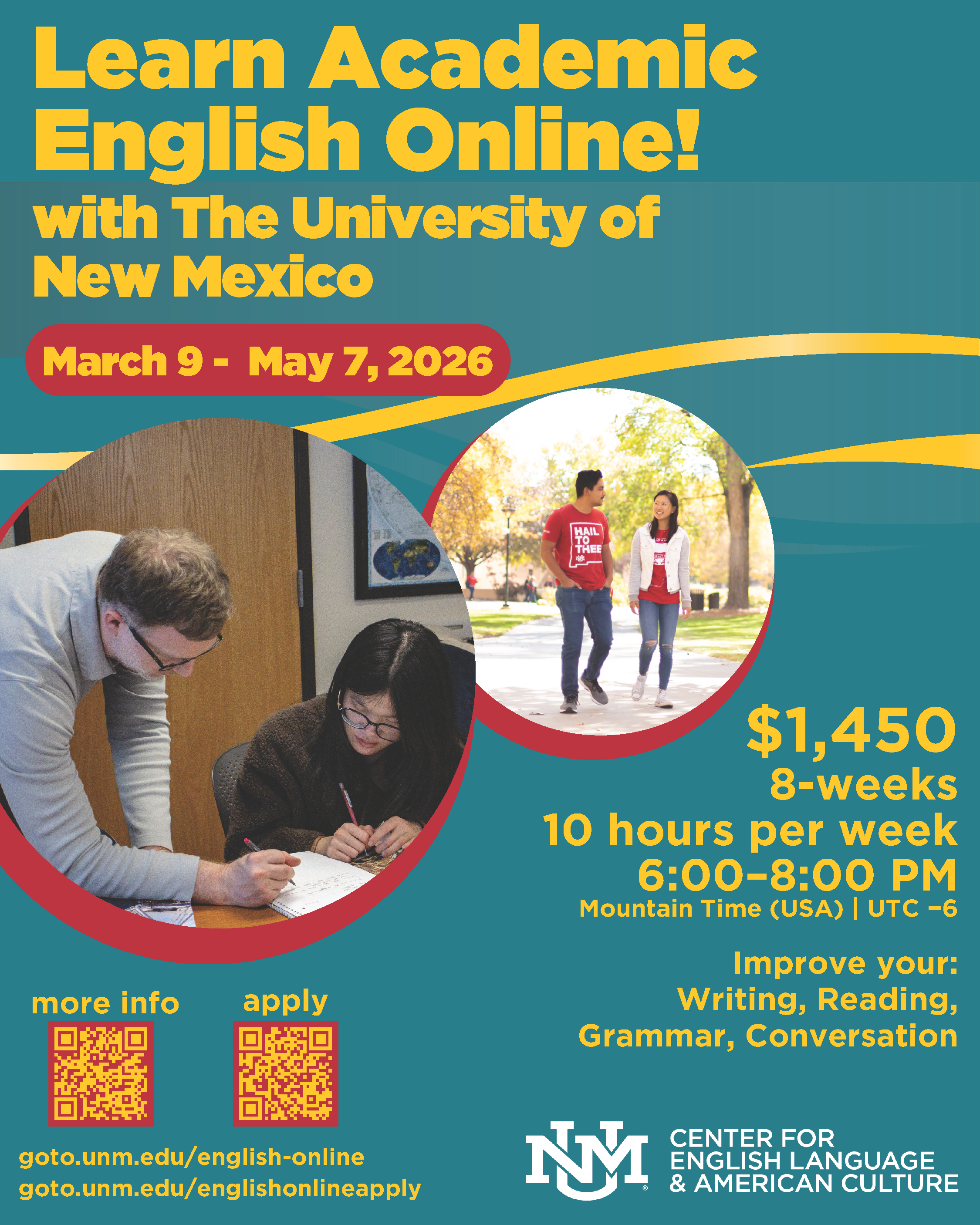 The Center for English Language and American Culture (CELAC) at the University of New Mexico (UNM) offers an intensive English program for international students. Founded in 1889, UNM is a research-oriented comprehensive university with a strong commitment to international engagement. CELAC has provided intensive English education for international students since 1978. In 2026, CELAC will offer an 8-week online program designed to help students improve their academic English skills. This program is especially suitable for students who wish to strengthen their academic writing, reading, grammar, and conversational English. Students can study with professional university instructors without leaving their home country.