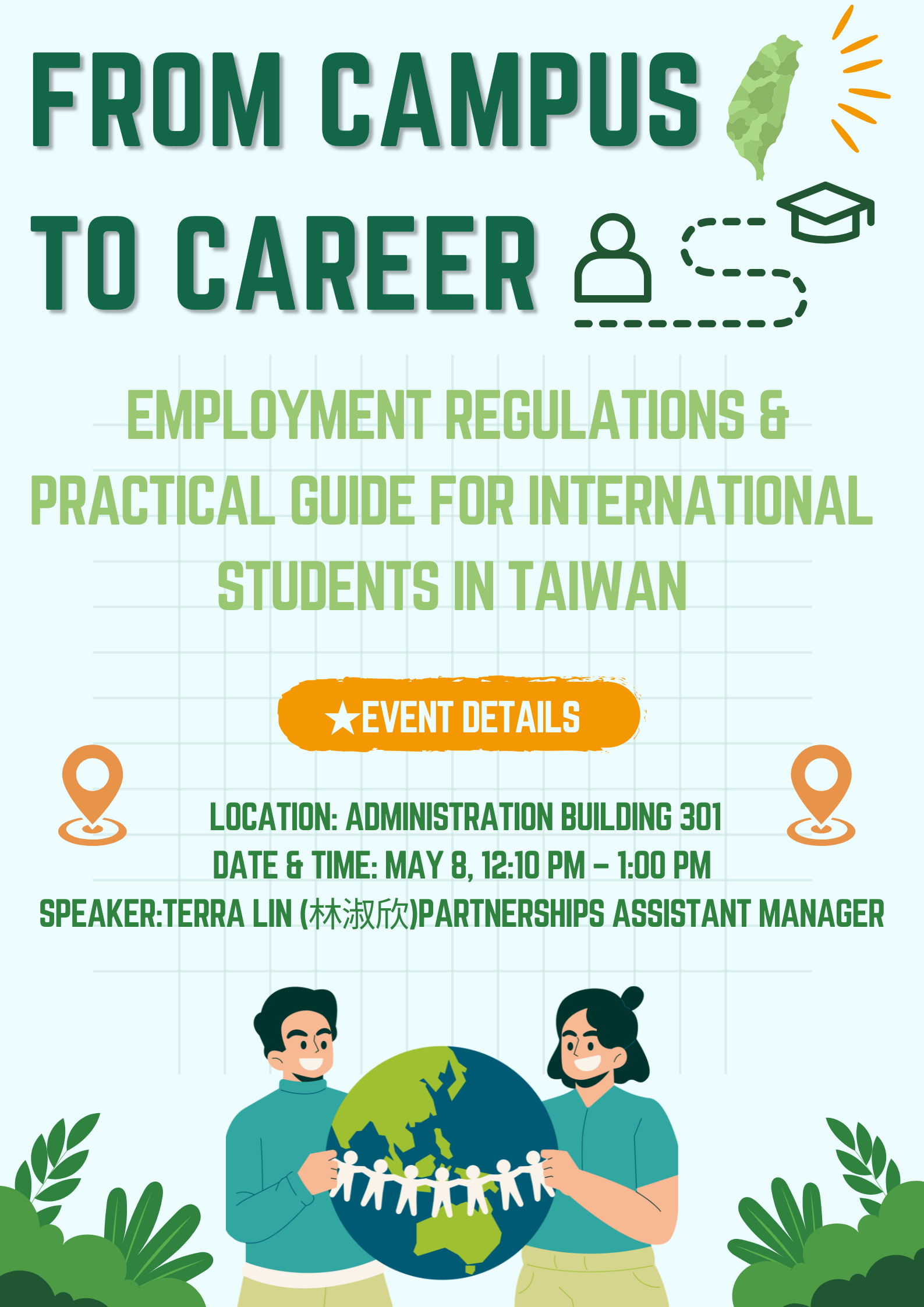 This session will cover key topics including Taiwan’s policies and regulations for international graduates, application procedures, and important tips for visa conversion. It aims to help you navigate the transition from student life to your professional career with confidence.