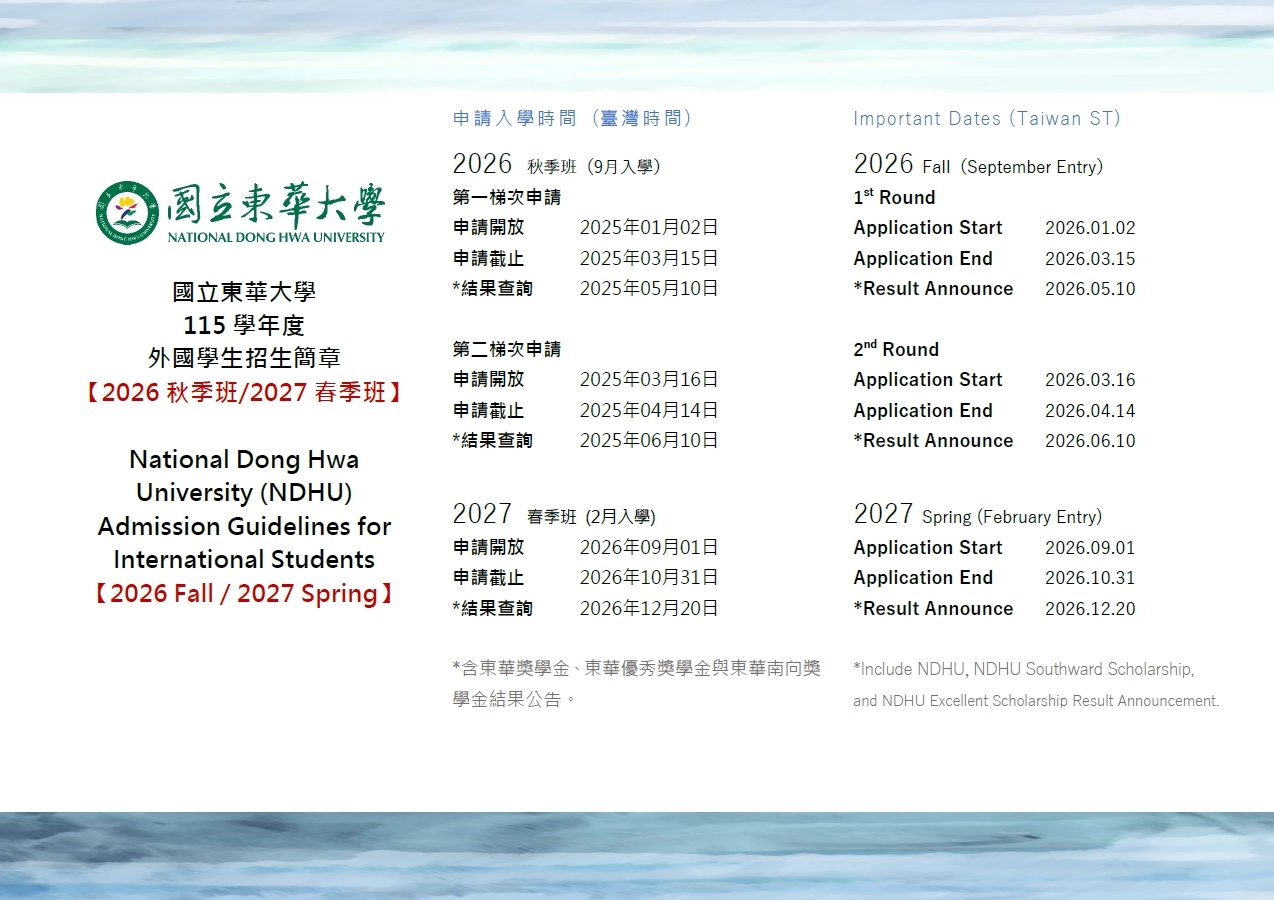Note: If you are interested in applying for admission to transfer to NDHU, please refer to our Admission Guidelines for Transfer Programs(國立東華大學外國學生轉學招生簡章) for detailed information.
